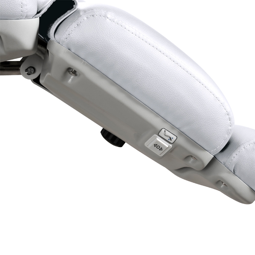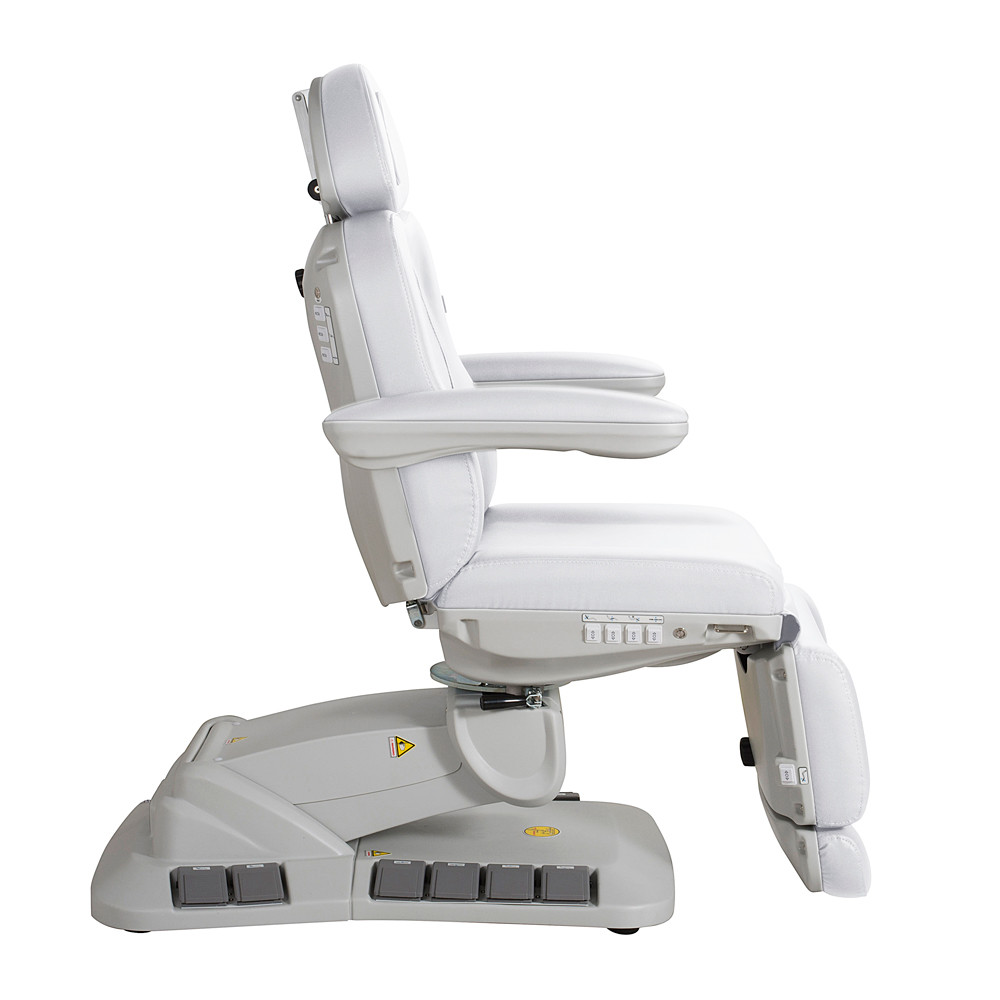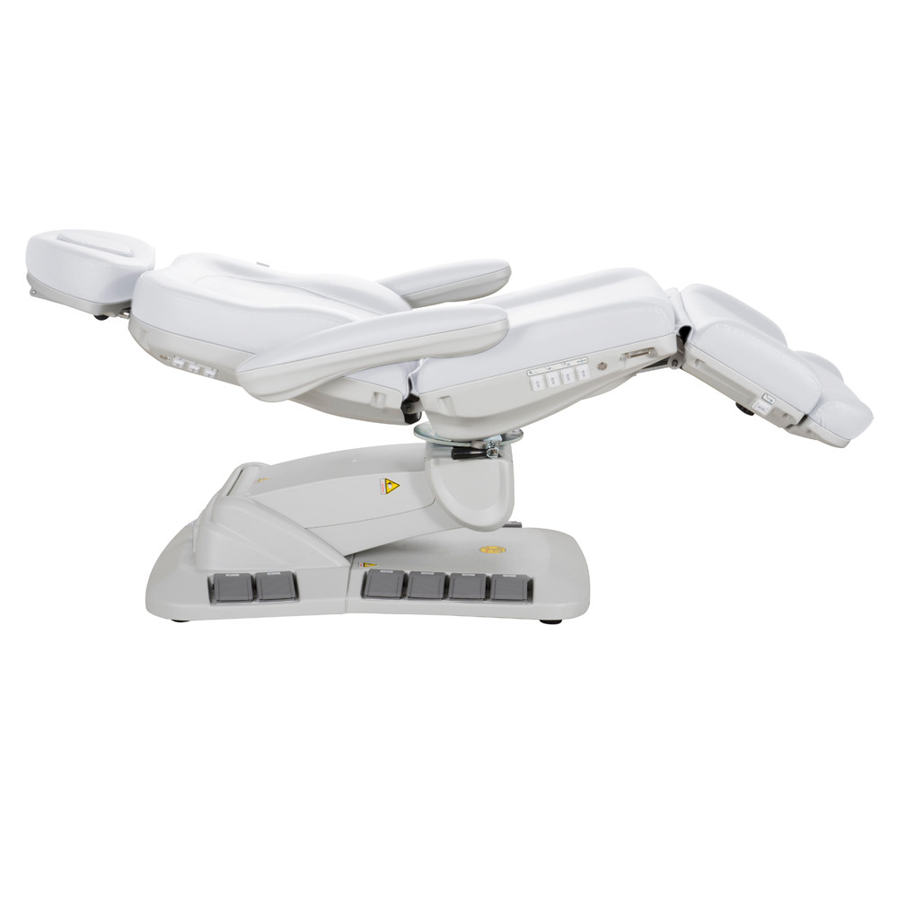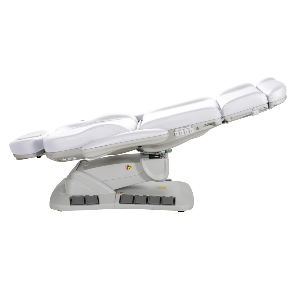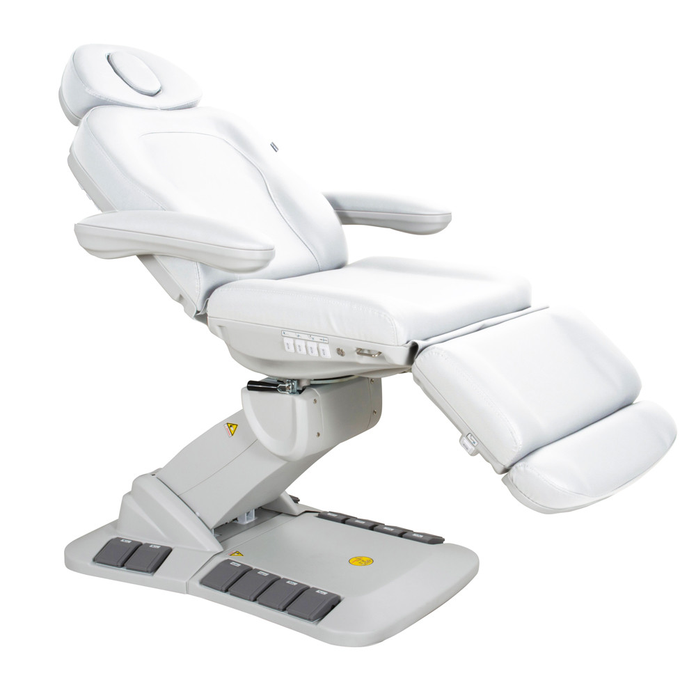 A zavartalan kézmozdulatok és a nagy precizitást igénylő munkák élharcosa legújabb AE402246EB Medical Plus orvosi és kozmetikai kezelőágyunk. A lábbal és kézzel is vezérelhető kezelőágy a szépészeti, vagy orvosesztétikai kezelésekhez szükséges szinte minden kezelési pozícióba beállítható. Akár kézzel, akár lábbal is vezérelhető, hogy a munkavégzés közben egy pillanatra se kelljen figyelmet veszítenie használójának. A kívánt pozíció beállítását 4 nagy teljesítményű elektromos motor segíti és az elért helyzetet igény szerint akár az eszköz memóriájába is eltárolhatjuk, hogy az később újra előhívható legyen. A vendégek könnyed ki és beszállását felhajtható karfák, elforgatható ülőrész és egy reset gomb is segíti. Utóbbi használatával az ágy magától alaphelyzetbe állítása végezhető el minden egyéb extra figyelem nélkül.