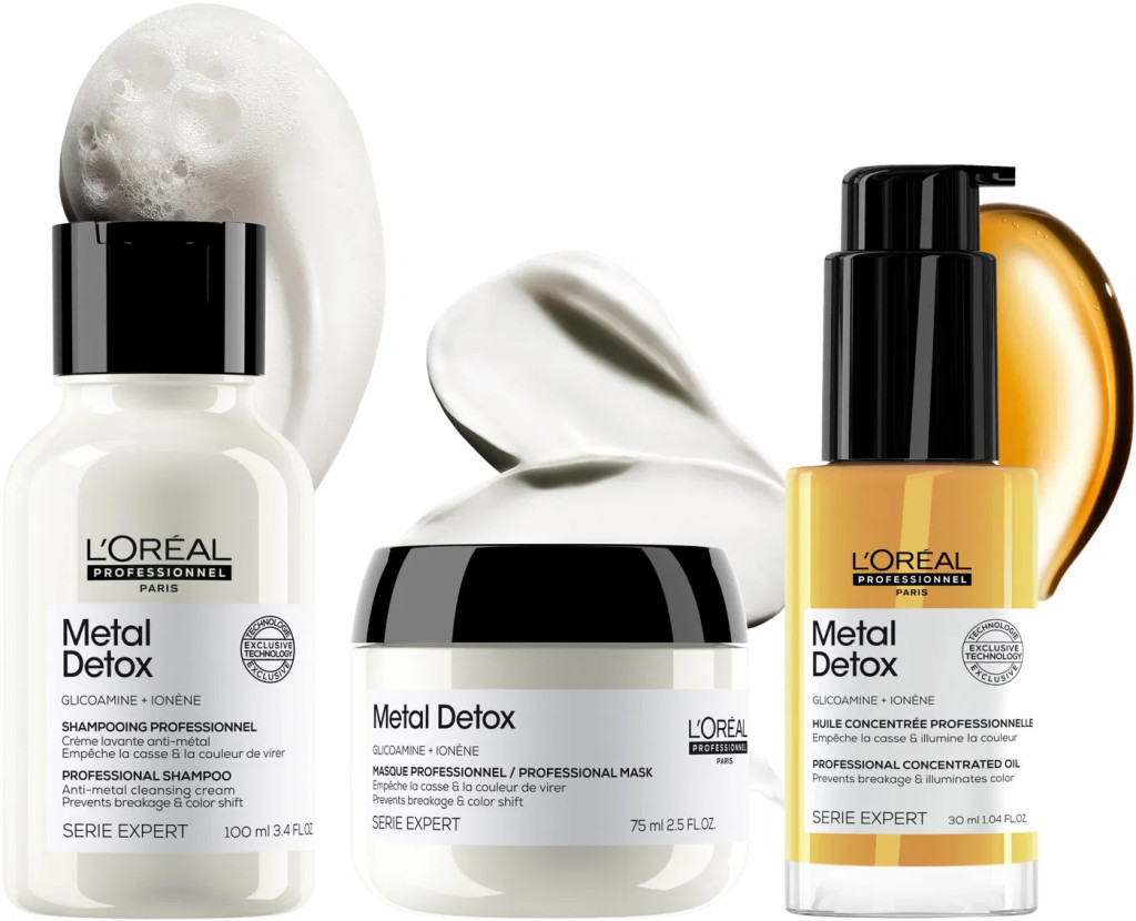 A L’Oréal Professionnel Serie Expert Metal Detox Trio Mini (2025) egy praktikus, utazó kiszerelésű hajápoló szett, amely hatékonyan eltávolítja és semlegesíti a hajban felhalmozódott fémionokat. Az innovatív Glicoamine technológia mélyen behatol a hajrostokba, megköti a káros réz- és fémrészecskéket, így megelőzi a hajtörést, a színfakulást és a festés utáni károsodást. A mini szett tökéletes választás utazáshoz, próbaként vagy szalon-kliens mintaként is.